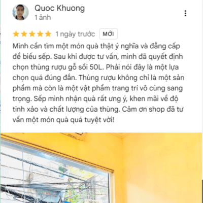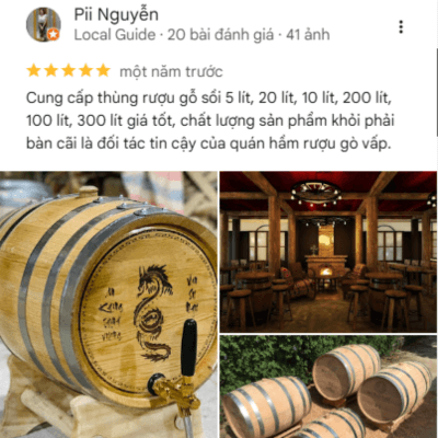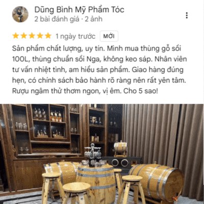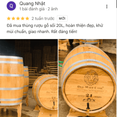Sản phẩm chất lượng, uy tín. Mình mua thùng gỗ sồi 100L, thùng chuẩn sồi Nga, không keo sáp. Nhân viên tư vấn nhiệt tình, am hiểu sản phẩm. Giao hàng đúng hẹn, có chính sách bảo hành rõ ràng nên rất yên tâm. Rượu ngâm thử thơm ngon, vị êm. Cho 5 sao!